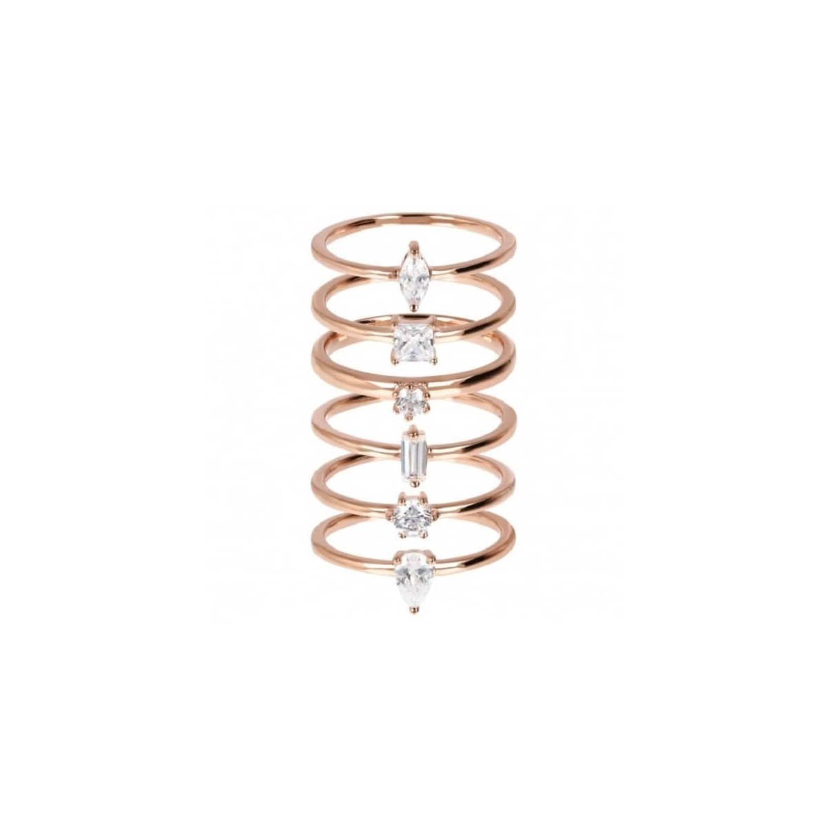 Set di sei anelli con cristalli diversi l'uno dall'altro, placcati in oro rosa 18kt