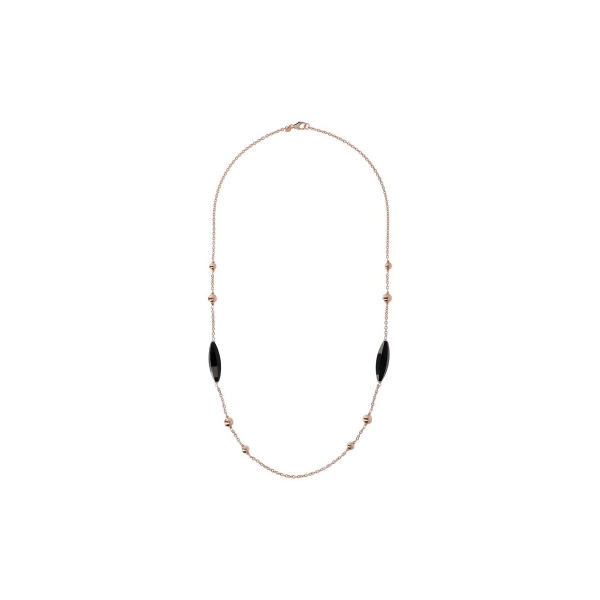 Collana lunga composta da una semplice base catena rolo ovale, sfere martellate in oro rosa, e pietre in onice nera allungata ovale. Bella sempre, dal mattino alla sera.