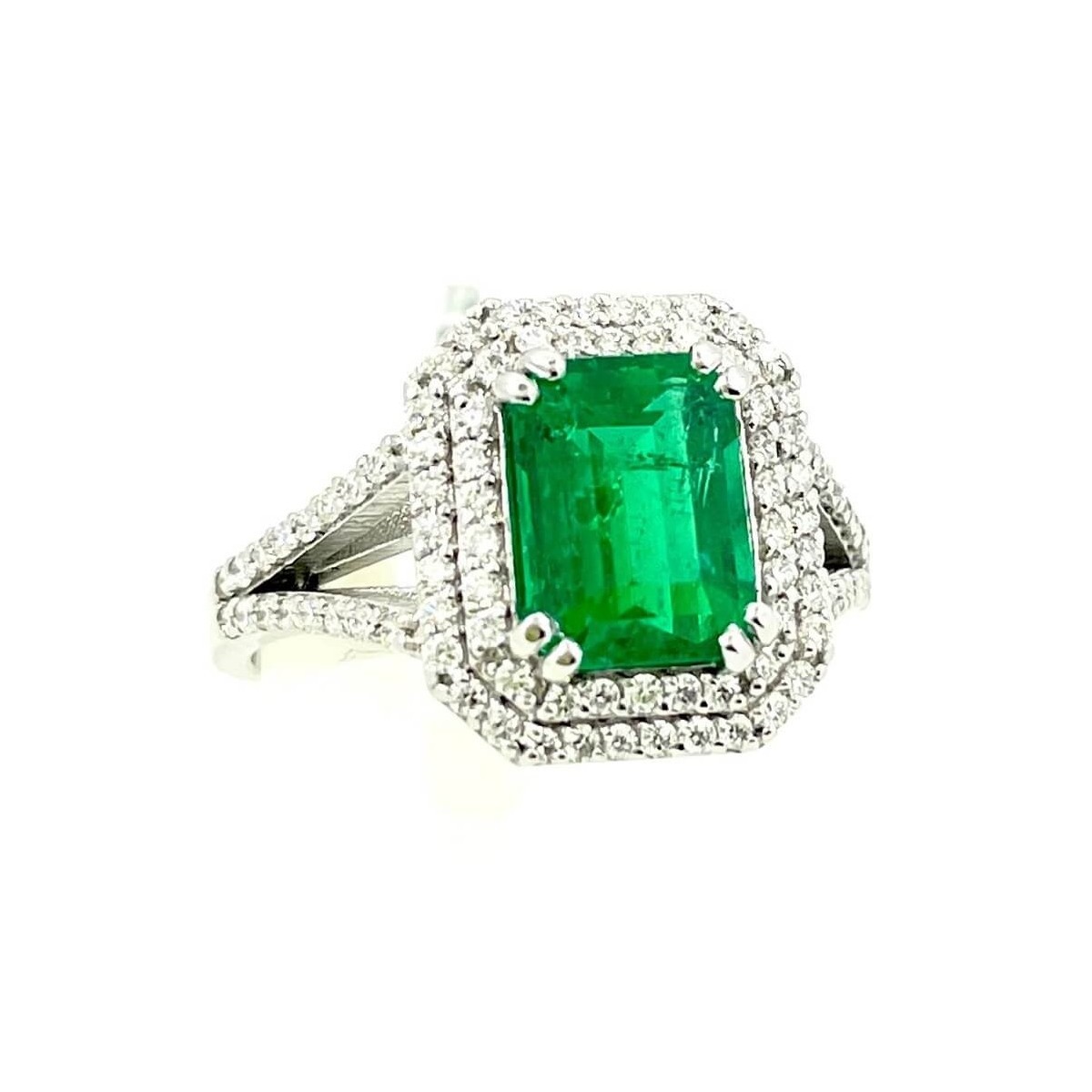 In questo anello di produzione artigianale, dallo stile particolarmente classico, il nostro orafo ha incastonato in una solida e robusta montatura in oro bianco 18 kt uno stupendo Smeraldo Naturale originario della Colombia e precisamente dalla miniera di Muzo dal taglio ottagonale rettangolare, denominato taglio smeraldo, dal colore eccezionale verde brillante intenso e per impreziosire ulteriormente questo gioiello abbiamo contornato la Smeraldo con due file di Diamanti Naturali taglio Brillante così come anche il gambo