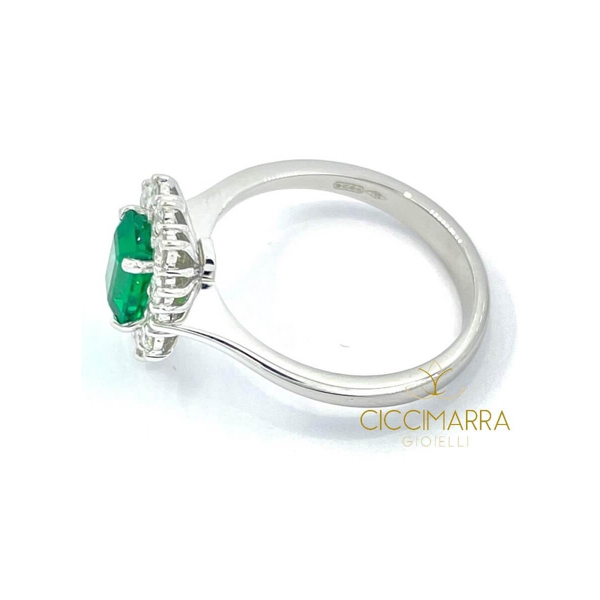 In questo anello Giorgio Visconti ha incastonato in una solida e robusta mantatura in oro bianco 18 kt uno stupendo Smeraldo Natutale dal taglio rettangolare, denominato taglio smeraldo, dal colore verde brillante intenso e per impreziosire ulteriormente questo gioiello ha contornato la Smeraldo con ben 12 Diamanti Naturali taglio Brillante