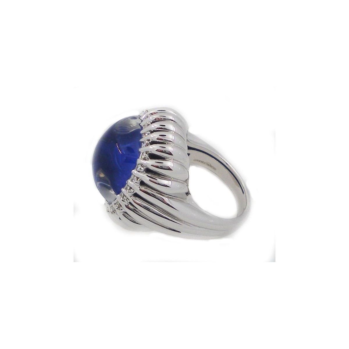 Anello linea Passione in oro bianco 18 kt e diamanti naturali con cristallo di rocca cabochon e zaffiro motivo bombato rigato