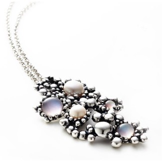 Collana lunga Giovanni Raspini della collezione Sunrise realizzata in argento 925 con pendente impreziosito da perle naturali, quarzo e madreperla che uniti alla luminosità dell'argento ricreano i colori dell'alba.