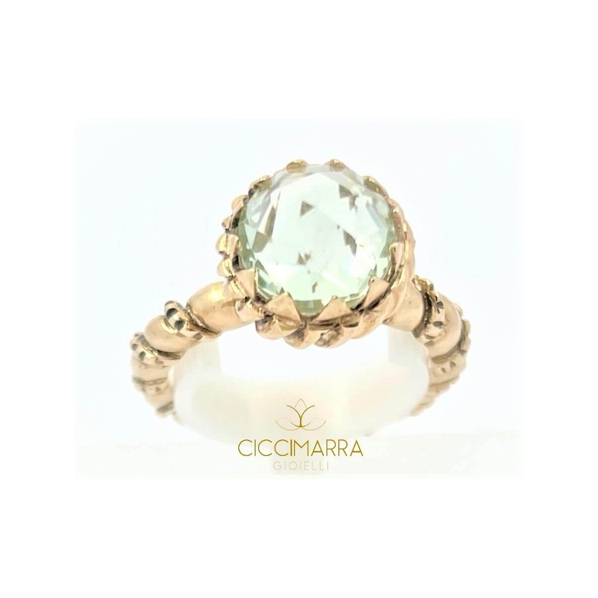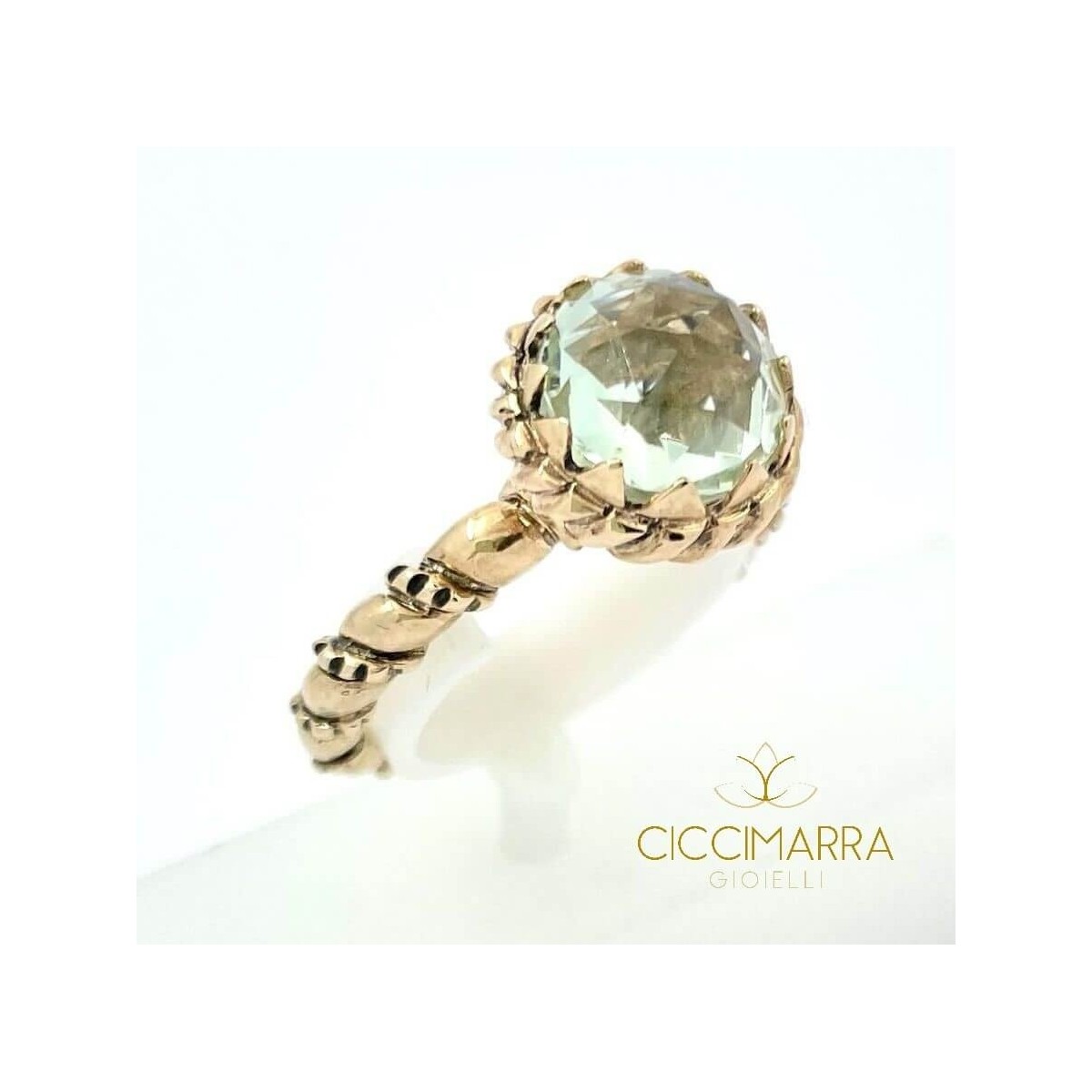 Anello Mini con prasiolite dal taglio rotondo e sfaccettato, montata su un piccolo castone con motivo attorcigliato a Torsade, chiusa da griffes in rilievo. Il disegno a torciglione si ritrova anche sulla fede.