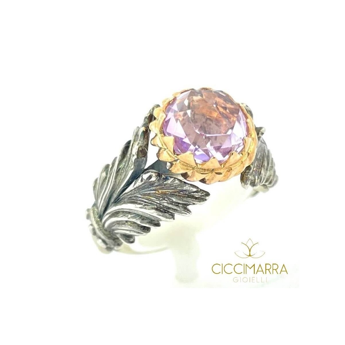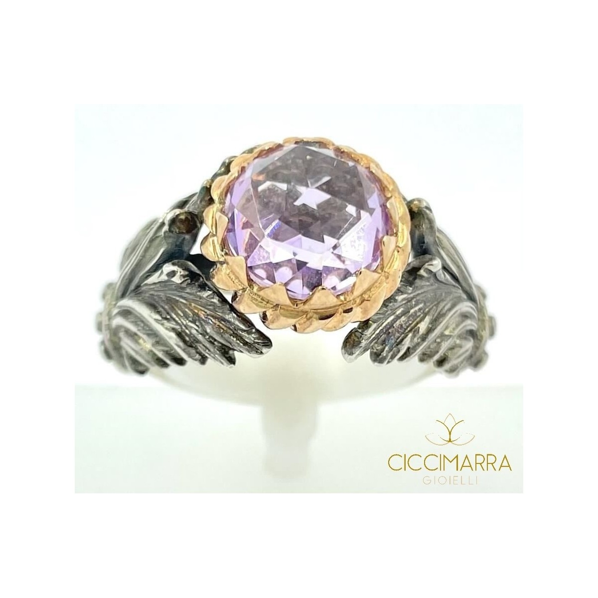 Anello della collezione torsade con fascia lavorata in argento 925, incastonatura in oro rosa che circonda la pietra sfaccettata rosa di francia.