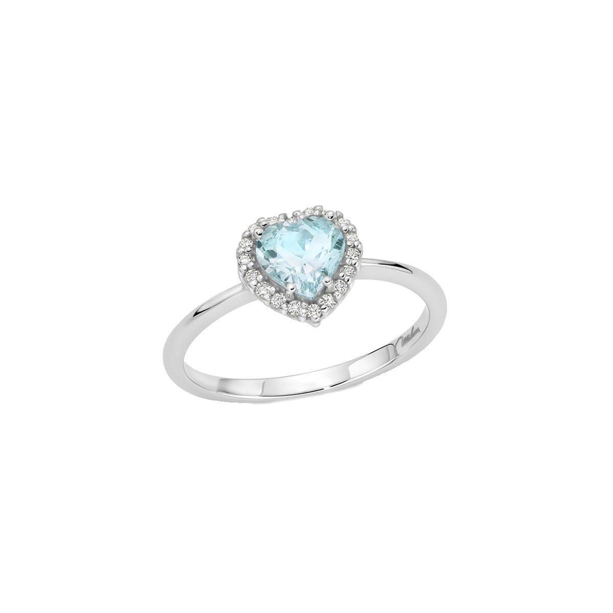 Anello da donna Miluna della collezione Le Gemme realizzata in oro bianco 18 carati con Acquamarina centrale naturale taglio cuore sfaccettato 0,64 carati impreziosita da una corona di 18 diamanti naturali taglio brillante 0,09 carati.