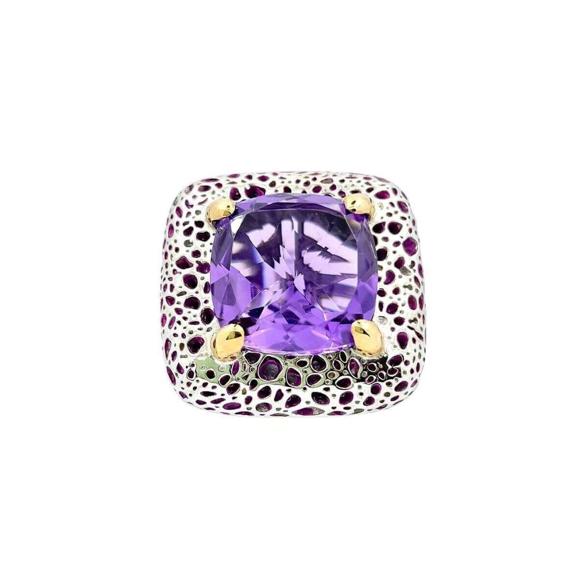 Anello grande della maison Mimì collezione Vulcanica realizzato in prezioso argento lavorato ad effetto lava vulcanioca con dettagli in smalto viola ed al centro una grande Ametista taglio cuscino incastonata in quattro punte di oro rosa 9kt.