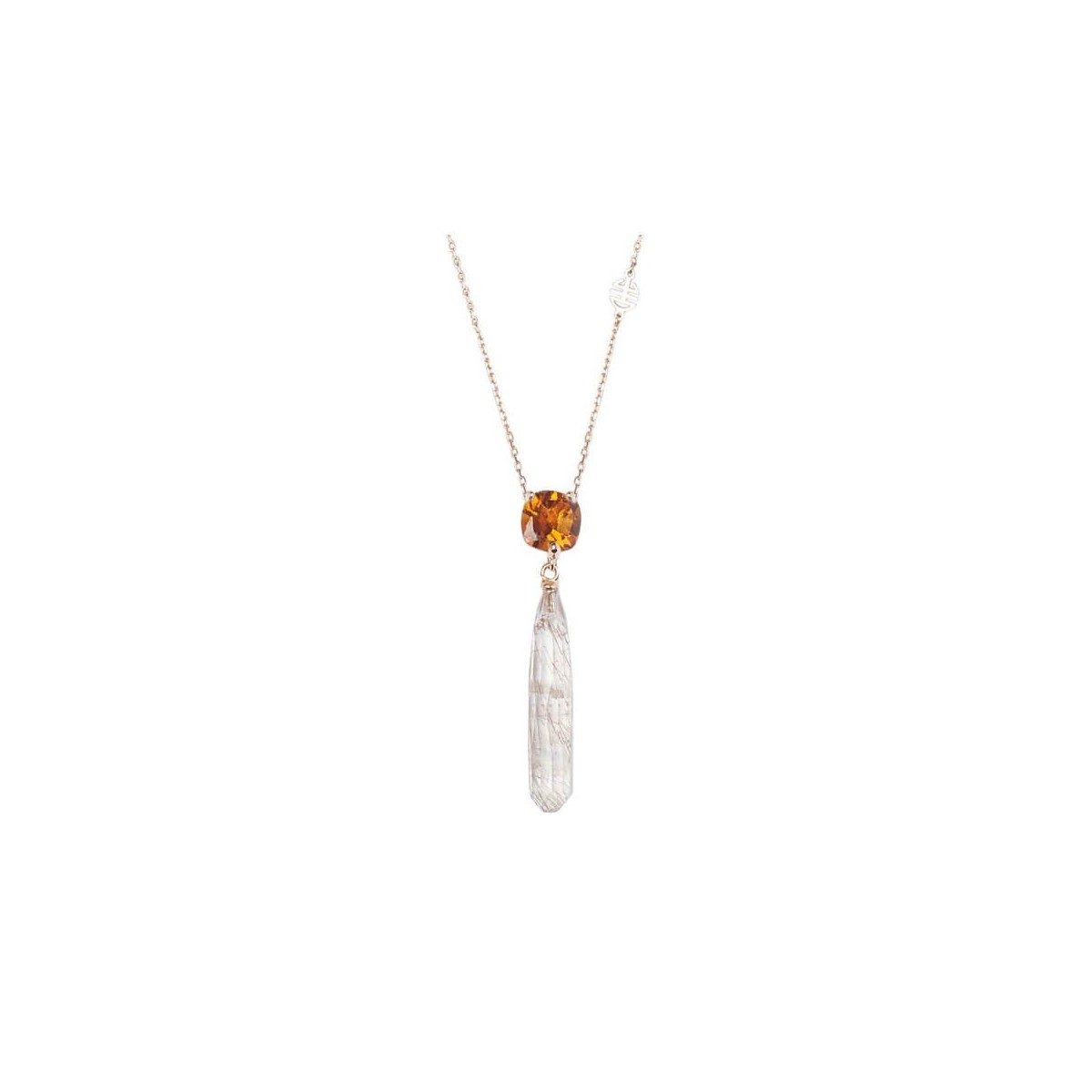 Collana con pendente da donna Mimì della collezione Shanti realizzata in oro rosa 18 carati con gemma centrale di quarzo citrino naturale sfaccettato colore brandy da 8x8 mm con al di sotto un quarzo rutilato taglio briolette con dimensioni di circa 30 x 6 mm.