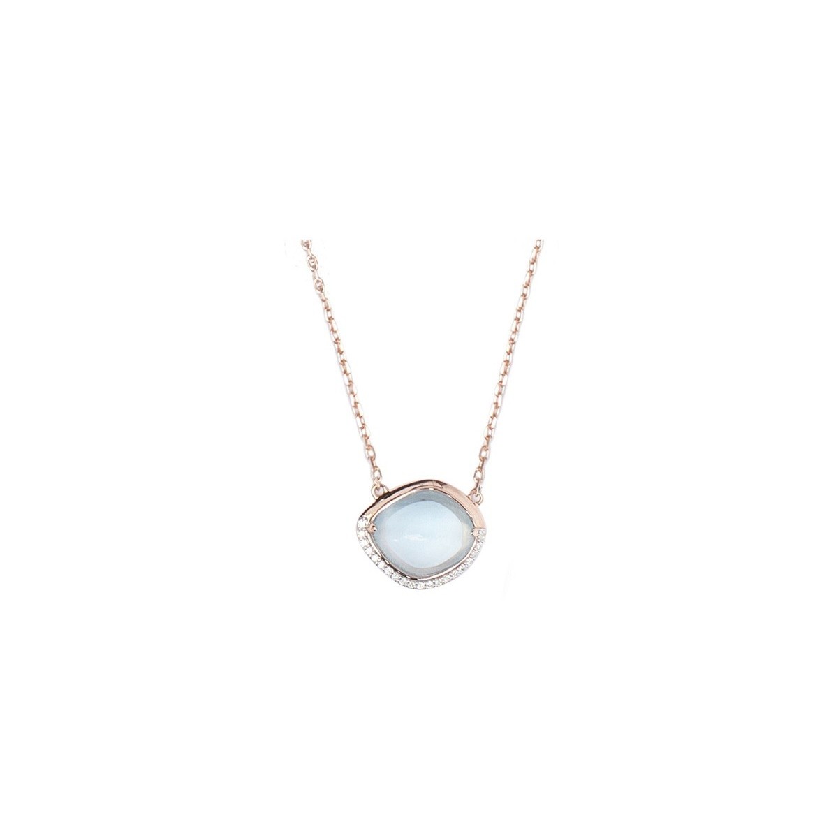Collana da donna Mimì della collezione Dune realizzata in oro rosa 18 kt con pendente con gemma centrale di topazio naturale taglio cabochon nominato "sky blu" per il suo particolare colore di circa 13x11 mm contornato per metà perimetro da diamanti naturali taglio brillante di 0,11 carati in totale.