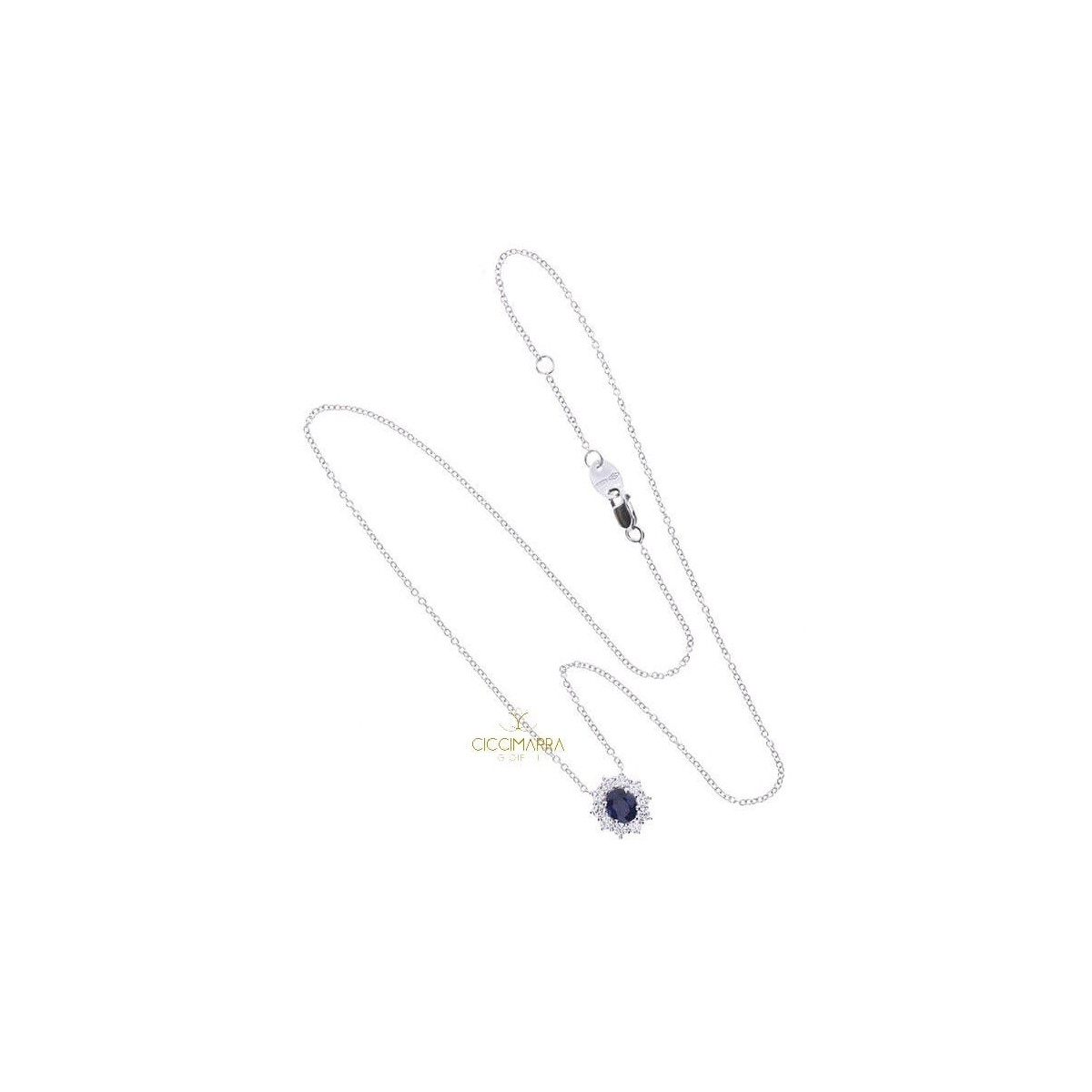 Collana con pendente della collezione Love for Color in oro bianco 18kt(750/1000) con Zaffiro Blu Naturale taglio ovale contornato da 10 Diamanti nautali taglio Brillante.
