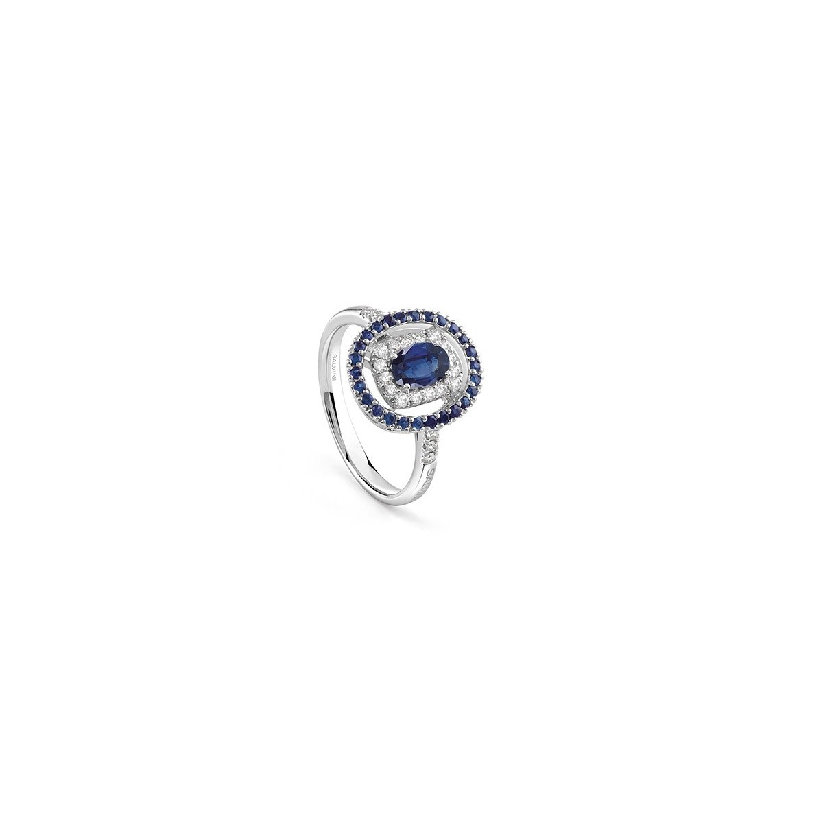 Anello classico da donna Salvini della collezione "Classico" realizzato in oro bianco 18 carati con zaffiro blu naturale dalla forma ovale di 0,64 carati centrale impreziosito da una cornice da diamanti naturali taglio brillante da 0,20 carati, contornato a sua volta da zaffiri blu naturali taglio tondo da 0,26 carati in totale