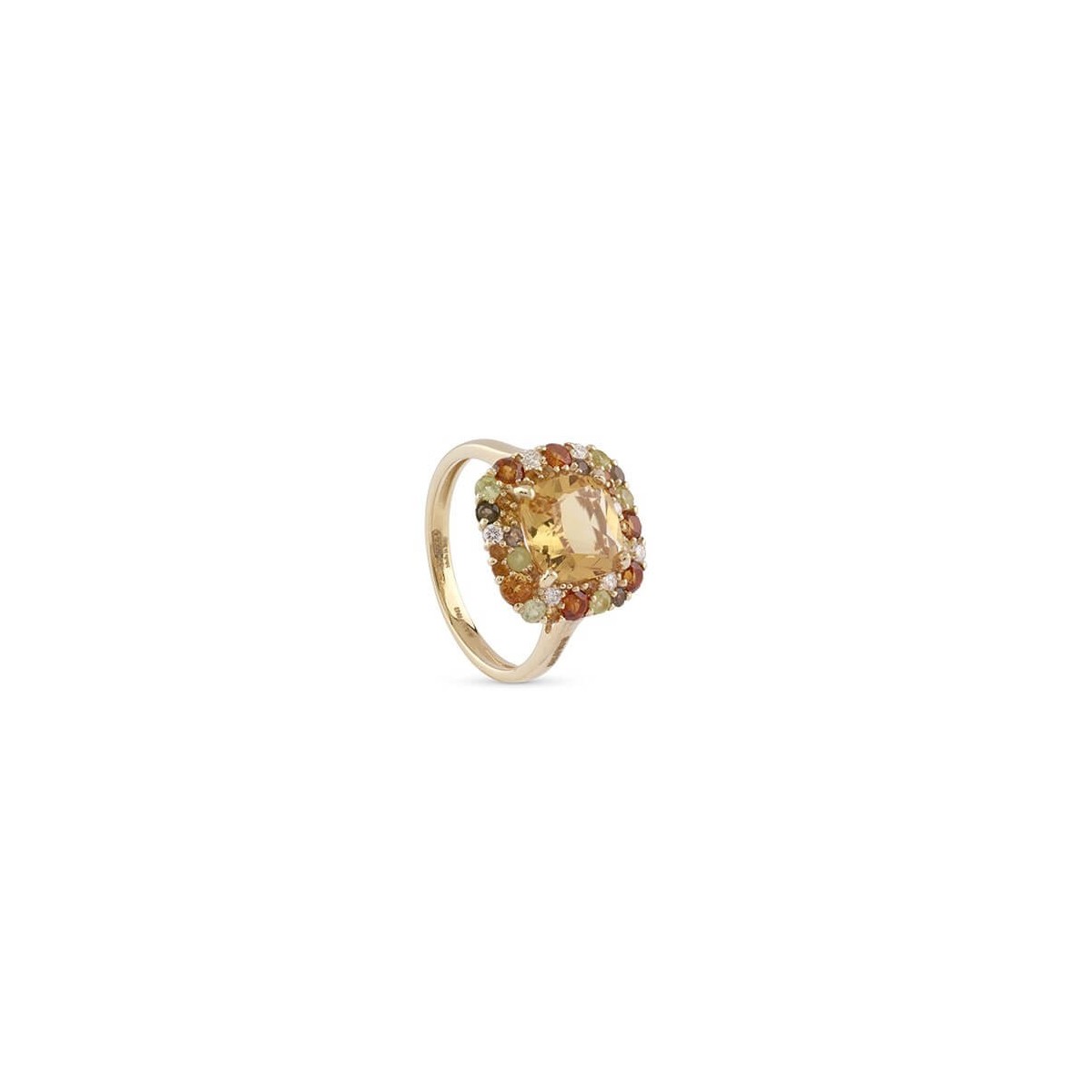 Anello donna con gemma di colore Salvini della nuovissima collezione Bon Bon, realizzato in oro giallo 18 carati impreziosito da un centrale di quarzo citrino taglio cuscino e da un contorno fantasia di diamanti naturali taglio brillante 0,10 carati totali e quarzi di varie misure tutti sulle tonalità del giallo, dal chiaro al color cognac.