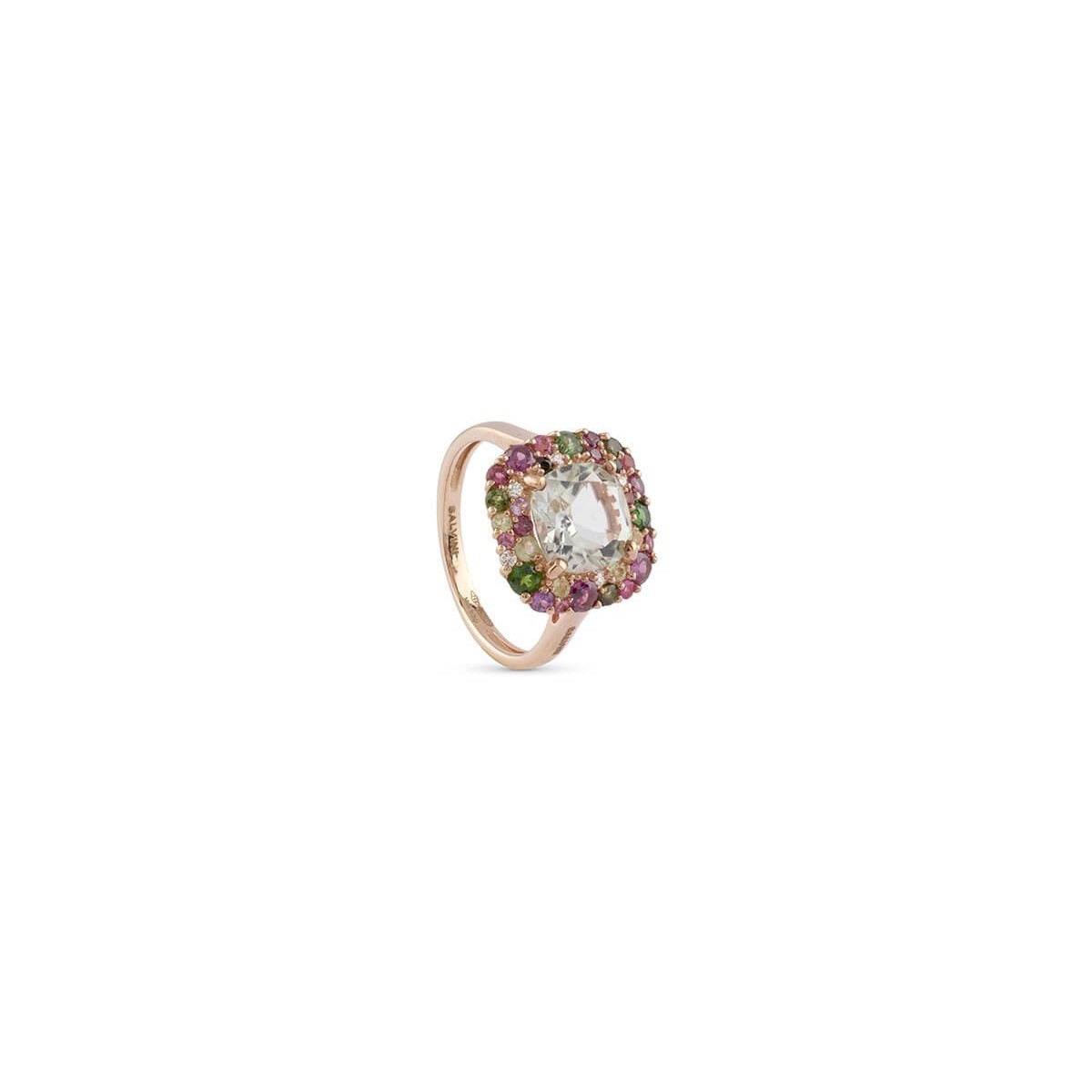 Anello donna con gemma di colore Salvini della nuovissima collezione Bon Bon, realizzato in oro rosa 18 carati impreziosito da un centrale di prasiolite verde chiaro taglio cuscino e da un contorno fantasia di diamanti naturali taglio brillante 0,10 carati totali, quarzi di varie misure tonalità dal verde al viola e tzavorite verde