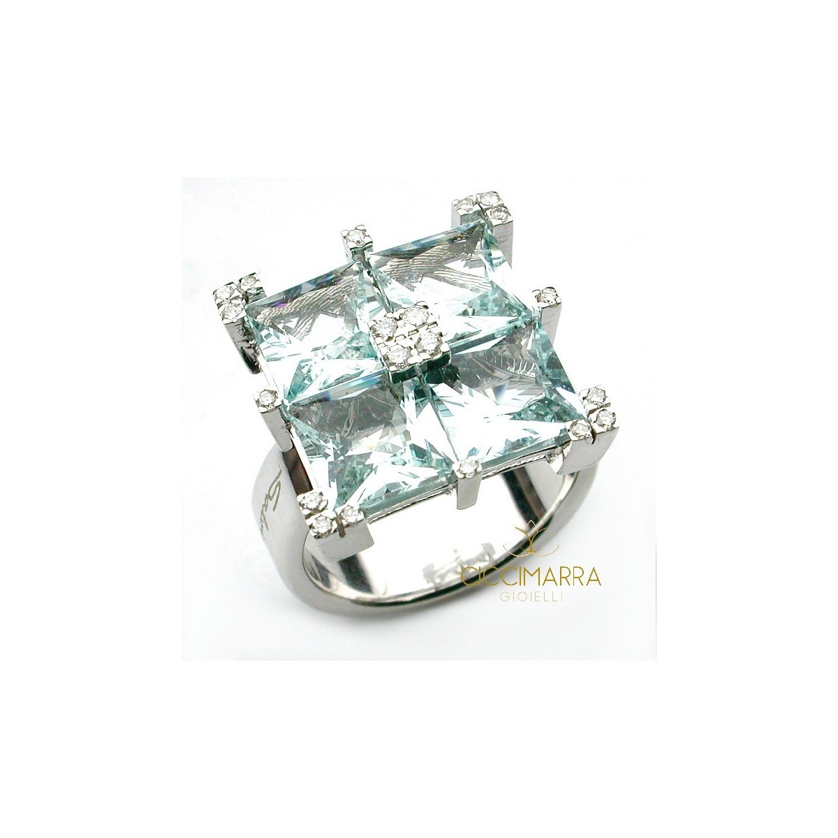 Anello in oro bianco 750/1000 composto da una base liscia su cui è montato un piccolo reticolo nel quale sono incastonate quattro pietre di acquamarina e diamanti taglio brillante.