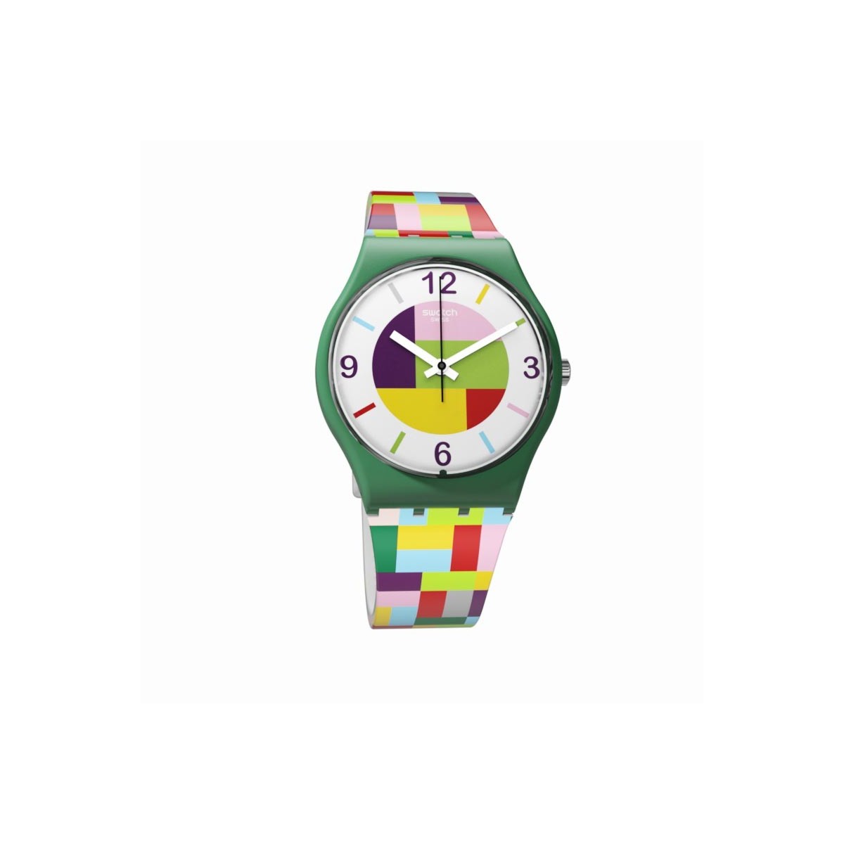 Larghezza 34.00 mm Spessore : 8.75 mm Altezza : 39.20 mm. Resistente all'acqua: 3 bar Questo allegro modello è dotato di un quadrante bianco con stampa multicolore, alloggiato in una cassa in plastica satinata verde. Lo straordinario cinturino è realizzato in silicone opaco grigio con stampa multicolore, per portare un arcobaleno di colori e forme geometriche sul tuo polso. Il modello è completato da un passante in silicone giallo e una fibbia in plastica satinata grigia.