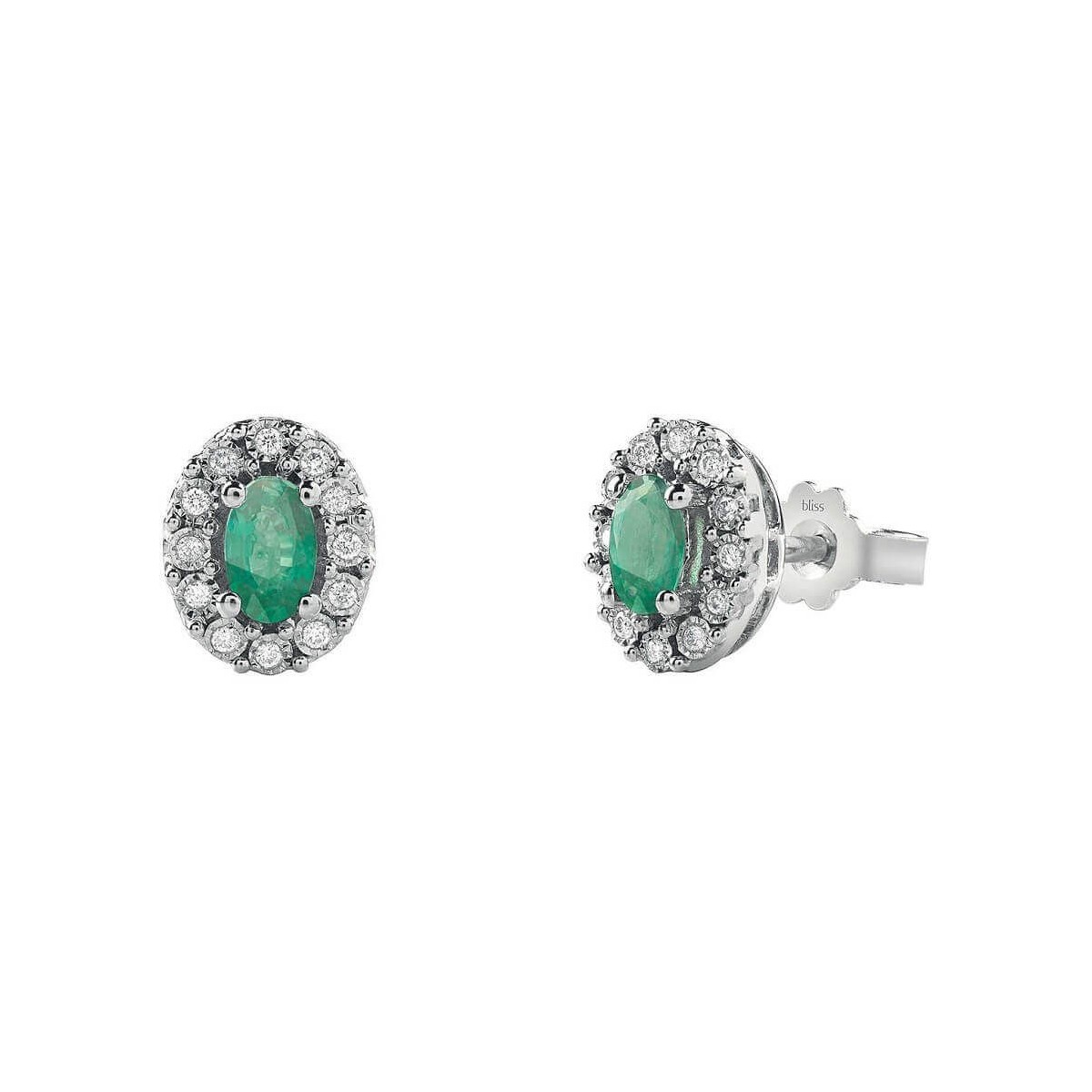 Orecchini da donna Bliss della collezione Regal realizzati in prezioso oro bianco carati 18 con Smeraldi naturali centrali da 0,70 carati in totale incorniaciato da una corona di ventiquattro (12 +12) diamanti naturali dal taglio rotondo brillante di carati 0,08 in totale.