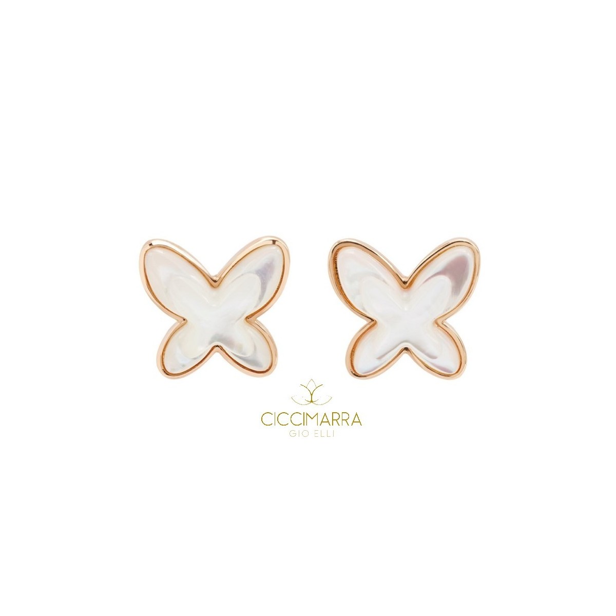 Particolarità di questi orecchini sono le farfalle in madreperla e la montatura in oro rosa creata a su misura della madreperla.