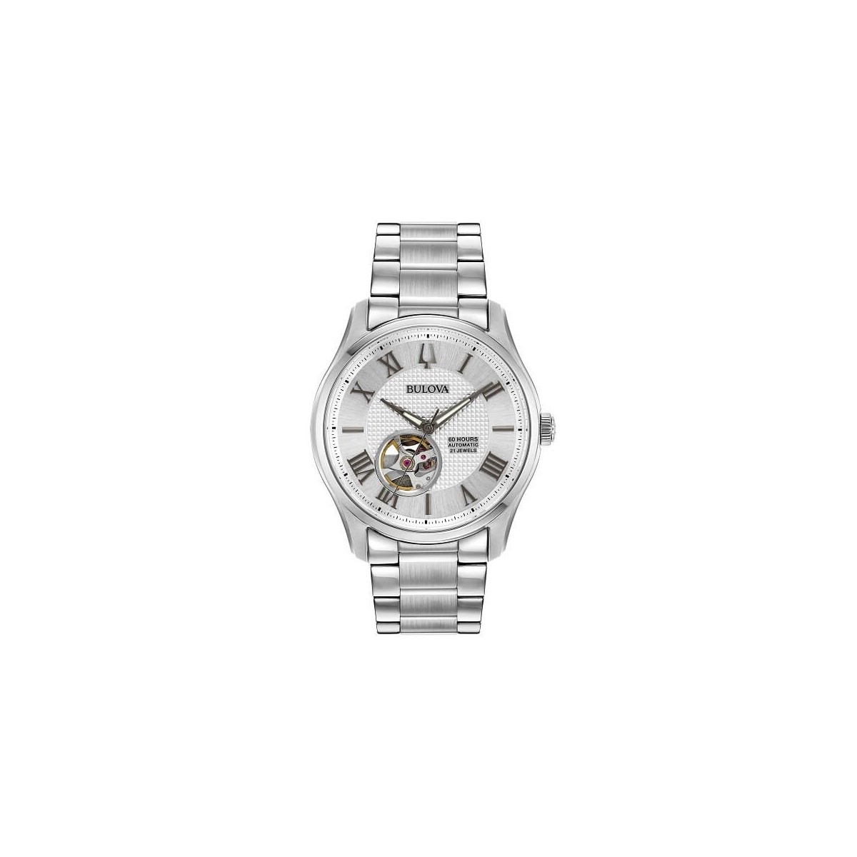 L'orologio solotempo Bulova della collezione Wilton 60 ore Riserve di Carica, con movimento meccanico 21 Rubini, è caratterizzato da un'importante cassa e cinturino in acciaio, quadrante analogico silver con vetro zaffiro e fondello a vite con oblò trasparente e movimento a vista.