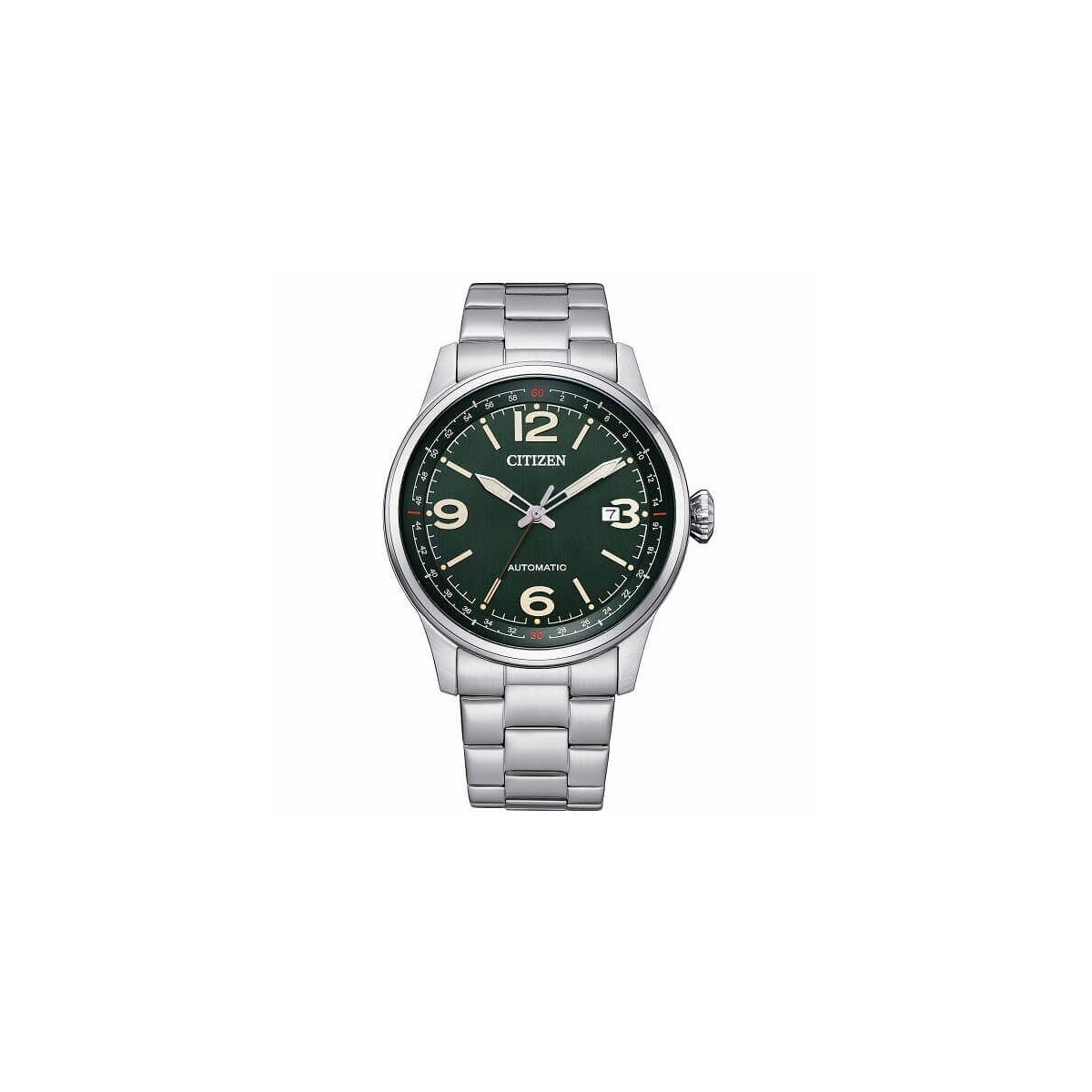 Orologio da uomo Citizen con funzione solotempo e movimento meccanico a ricarica automatica con 21 rubini e 21600 alternanze, cassa 42 mm in acciaio, fondo serrato a vite con oblò trasparente, vetro minerale e quadrante analogico di colore verde. Bracciale in acciaio satinato con chiusura di sicurezza.