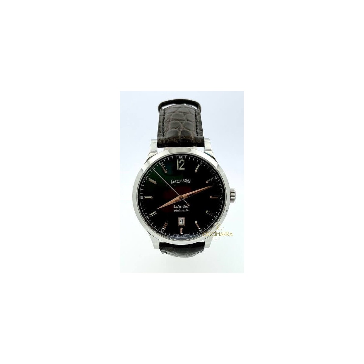 Orologio da uomo Eberhard, della collezione Extra-Fort, con funzione di solo tempo e movimento automatico. Orologio realizzato con cinturino in pelle di coccodrillo di colore marrone, cassa in acciaio 316L di 40 mm montante vetro zaffiro con lavorazione antigraffio ed antiriflesso, e quadrante silver con alternanza di numeri arabi ed indici e lancette in acciaio, datario posto ad ore 6. Chiusura ardiglione