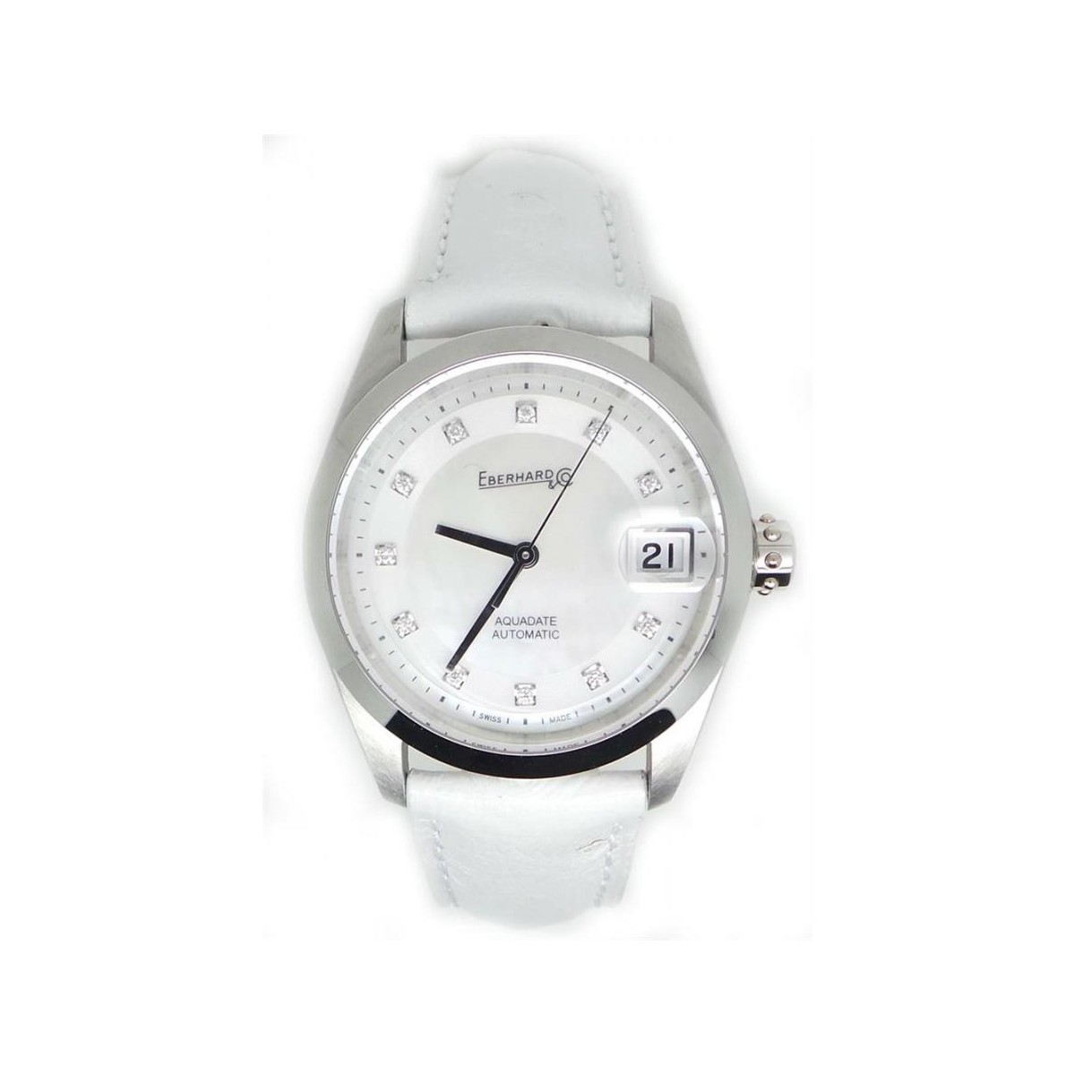 orologio in acciaio misura intermedia 35mm diametro, vetro zaffiro con lunetta di ingrandimento sulla data, quadrante madreperla con indici in diamanti, cinturino in pelle di struzzo con chiusura ardiglione, movimento meccanico a carica automatica, fondo a viti, corona a vite, water resistant 10 atm