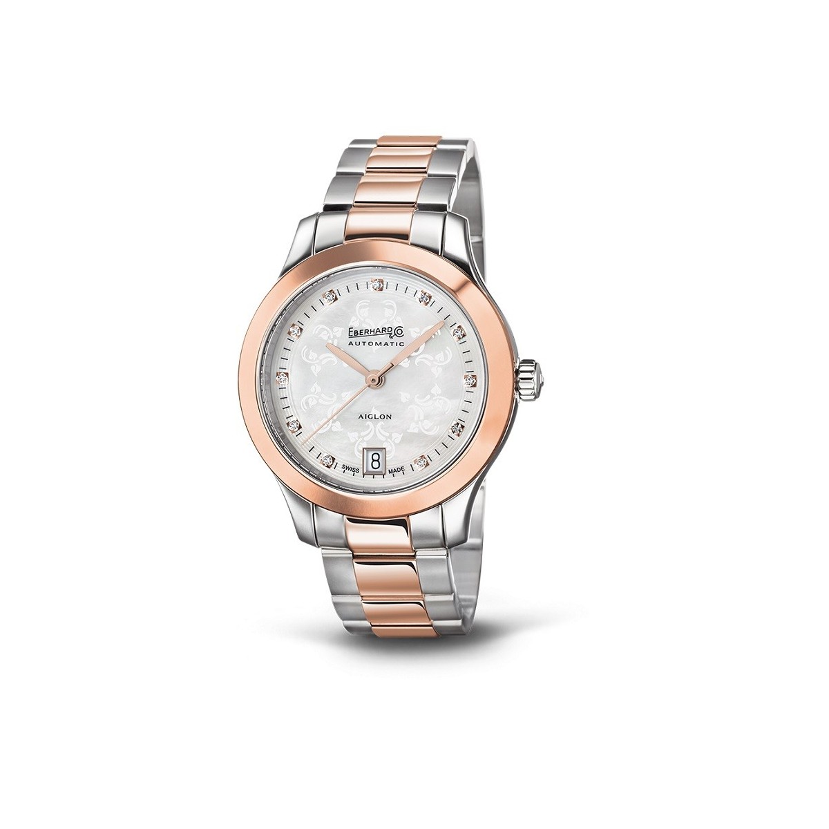 Orologio da donna Eberhard della collezione Aiglon Dame con funzione di solo tempo e movimento automatico. L'orologio è realizzato in acciaio Inox con inserti sul bracciale in oro rosa 18 kt con cassa del diametro di 35 mm e lunetta in oro rosè, vetro zaffiro con lavorazione antigraffio ed antiriflesso al cui interno troviamo il quadrante in madreperla con diamanti naturali taglio rotondo posti in corrispondenza dei numeri e lancette in oro rosa 18 kt.