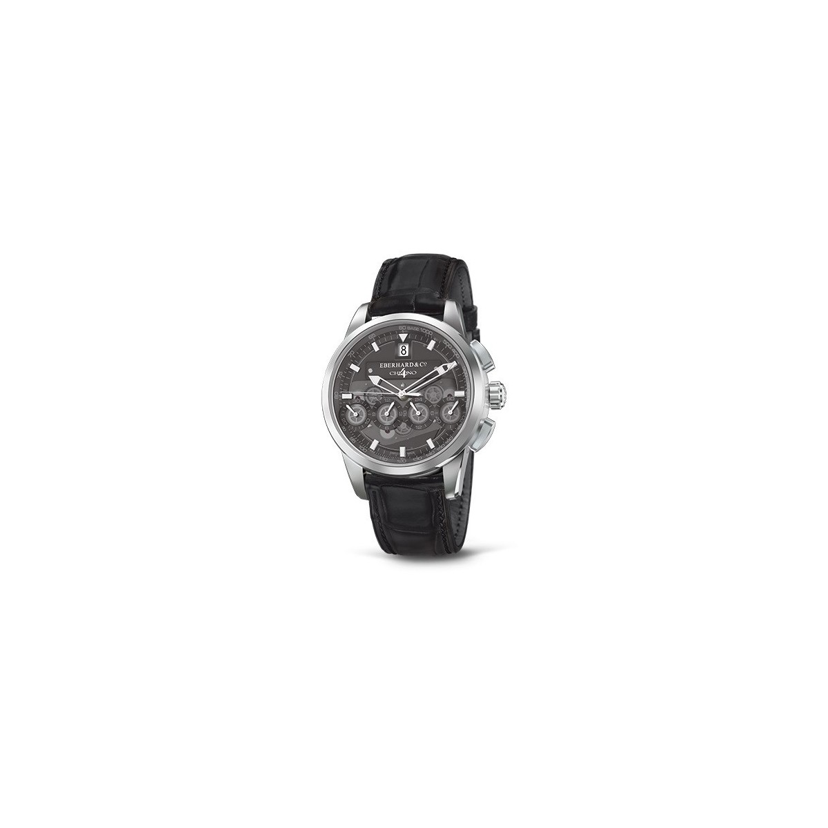 Una piastrina rodiata, fissata da 2 viti alla platina, riporta il nome del modello e il marchio storico Eberhard & Co., lo stesso utilizzato per il primo cronografo da polso del 1919.