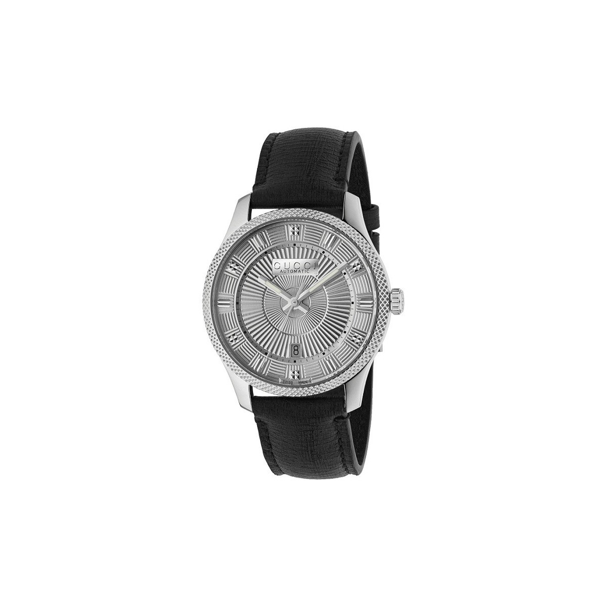 Dal quadrante silver particolare ed elegante il cui decoro in rilievo riflette i simboli tipici di Gucci, un orologio che non passerà inosservato.