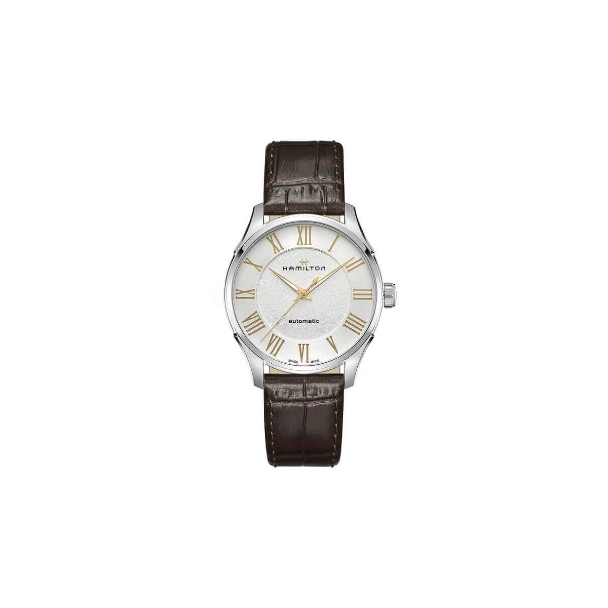 Orologio Hamilton, della collezione Jazzmaster, con movimento automatico calibro H-10 a tre sfere con data e riserva di carica superiore a 80 ore, con cassa in acciaio di 40 mm con quadrante bianco e lancette e indici, a numeri romani, dorati e cinturino in pelle stampa coccodrillo marrone con fibbia ad ardiglione.