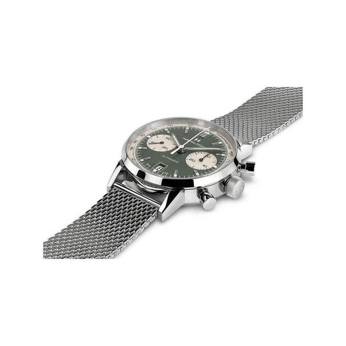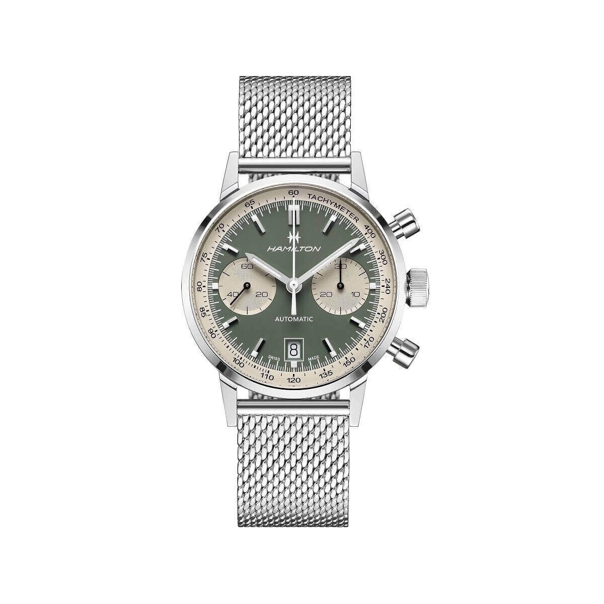 Orologio Hamilton Intra-Matic Automatico Chrono, della collezione American Classic, con funzione di solo tempo e movimento cronografo a carica automatica. L'orologio è realizzato con bracciale a maglia milanese in acciaio e cassa acciaio 40 mm con quadrante verde, dove troviamo due piccoli quadranti per cronografo, lancette con LumiBrite, indici a bastone e lunetta bianca. Chiusura deployante.
