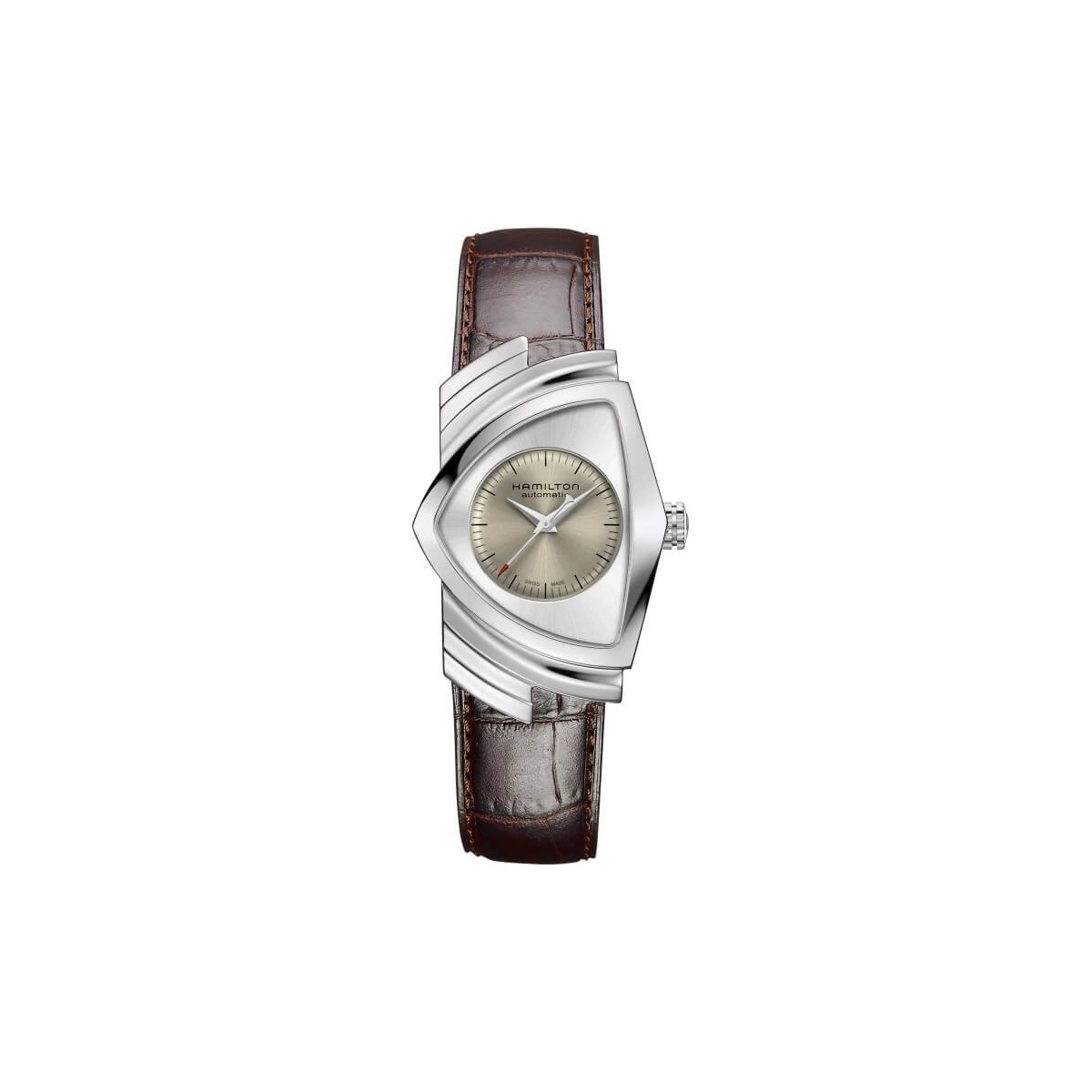 Orologio maschile Hamilton della collezione Ventura con funzione di solo tempo e movimento automatico. L'orologio dallo stile unico ed audace è caratterizzato da cinturino in pelle con motivo crocodile di colore marrone, cassa dalla forma a scudo trinagolare e quadrante bicolore esterno silver ed interno tondo di colore bronzo chiaro champagne. Fondello a vista con movimento e chisura deployante.