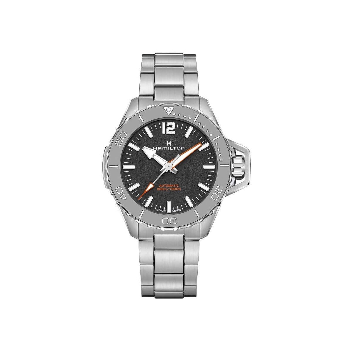 Orologio da uomo Hamilton, della collezione Khaki Navy modello Frogman con movimento automatico e riserva di carica fino a 80 ore. L'orologio presenta bracciale in acciaio lavorato satinato, cassa 46 mm montante vetro zaffiro con quadrante nero e lancette ed indici LumiBrite per una migliore leggibilità, anche sott'acqua.
