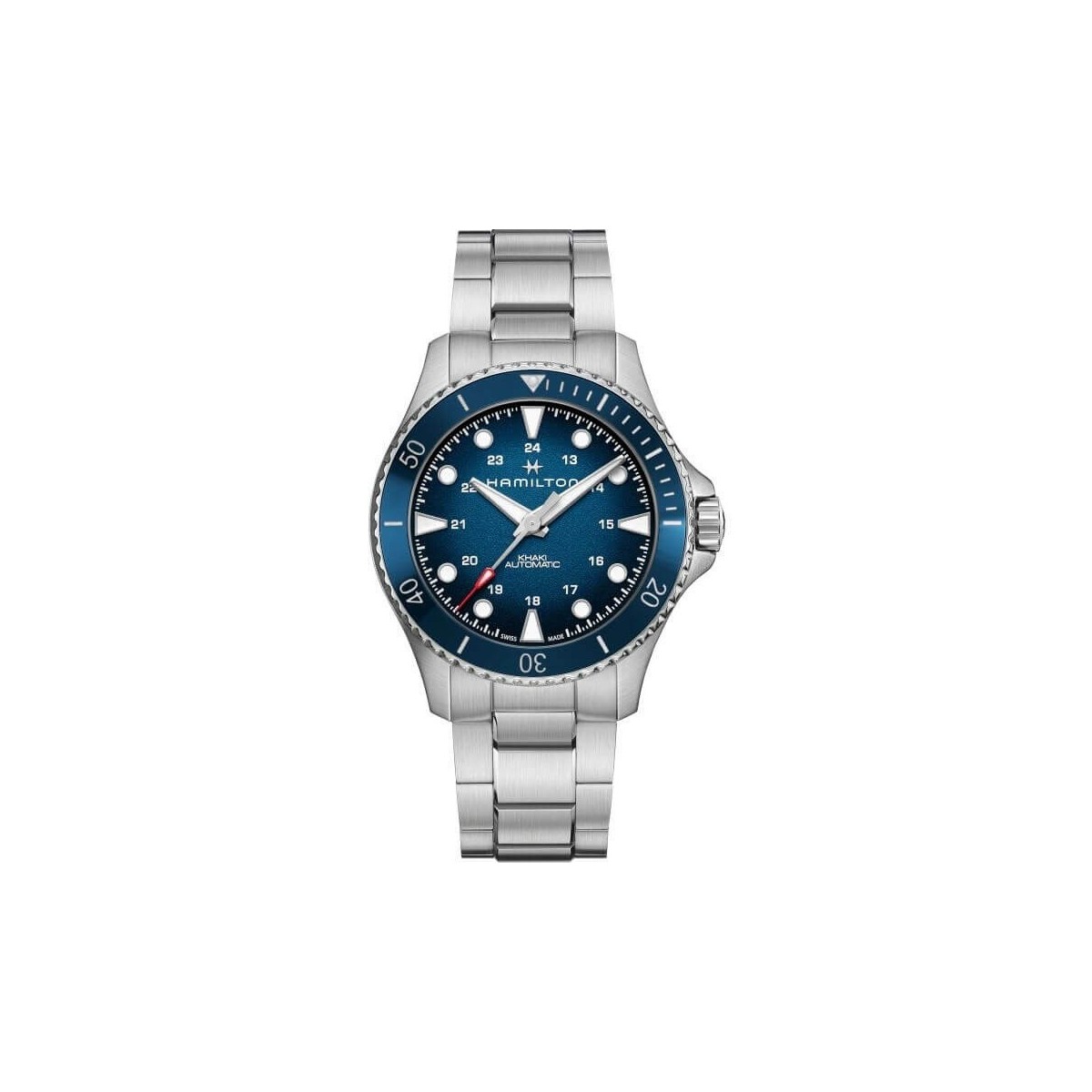 Orologio da uomo Hamilton, della collezione Khaki Navy modello Scuba con movimento automatico e riserva di carica fino a 80 ore. L'orologio presenta bracciale in acciaio lavorato lucido e satinato, cassa 43 mm montante vetro zaffiro con quadrante blu e ghiera blu.