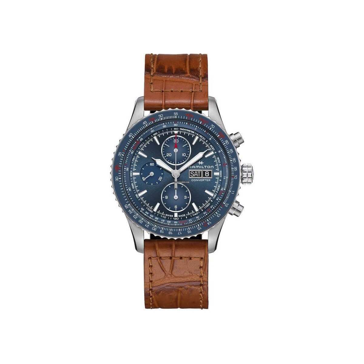 Orologio da uomo Hamilton Converter, della collezione Khaki Aviation, con funzione cronografo e movimento automatico con riserva di carica fino a 60 ore. L'orologio è caratterizzato da un design semplice e senza tempo dato dal cinturino realizzato in pelle di colore marrone con motivo crocodile, cassa in acciaio 44 mm montante vetro zaffiro con lavorazione antigraffio ed antiriflesso, quadrante blu con lancette LumiBrite e indici in acciaio. All'interno del quadrante sono presenti tre contatori del cronografo e datario ad ore 15.