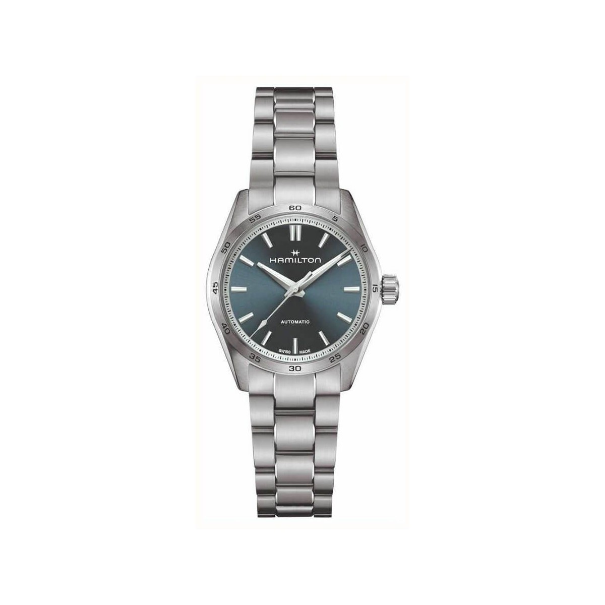 Orologio uomo/donna Hamilton Performer, della collezione Jazzmaster, con funzione di solo tempo e movimento automatico con riserva di carica fino a 80 ore. L'orologio è caratterizzato da un design semplice e senza tempo dato dal cinturino realizzato in acciaio inossidabile con maglie satinate, cassa in acciaio 34 mm montante vetro zaffiro con lavorazione antigraffio ed antiriflesso, quadrante blu chiaro con lancette LumiBrite e indici in acciaio.