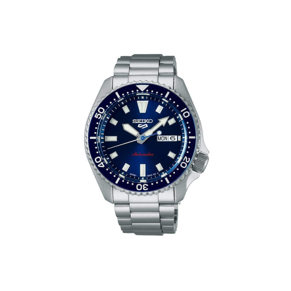 Orologio uomo, nuova linea 5 Sport, evoluzione del classico SKX In acciaio con cassa 42,5 mm, quadrante e lunetta girevole blu.