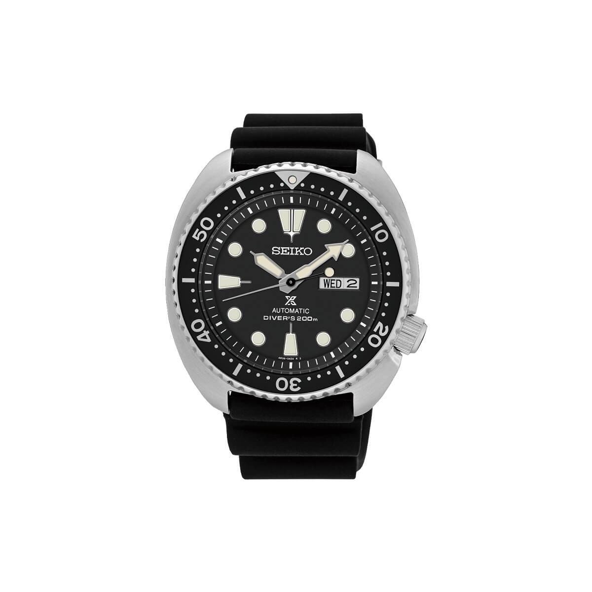 Orologio maschile con cassa in acciaio inox, cinturino in silicone nero, quadrante e ghiera girevole nera, indici e lancette bianchi, datario. La caratteristica e storica cassa a tartaruga di Seiko rende questa collezione immediatamente riconoscibile ed unica.