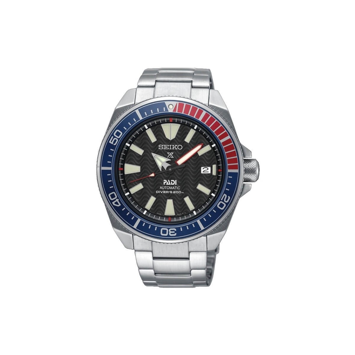 Orologio maschile con cassa e cinturino in acciaio inox, ghiera fissa blu e rossa, quadrante nero con indici e lancette bianchi, datario. Tipo di movimento:Automatico con capacità di carica manuale;Durata:Circa 41 ore; Materiale della cassa:Acciaio inox;Materiale in vetro:Hardlex;LumiBrite:LumiBrite su lancette e indici;Chiusura:Tripla chiusura pieghevole con blocco di sicurezza, rilascio a pulsante con estensore;Resistenza all’acqua:Subacqueo 200 m/660 piedi;Dimensione della cassa:Spessore: 12.8 ?,Diametro: 43.8 ?;Altre specifiche:Fondello a vite;Lunetta girevole unidirezionale; Referenza: SRPB99K1