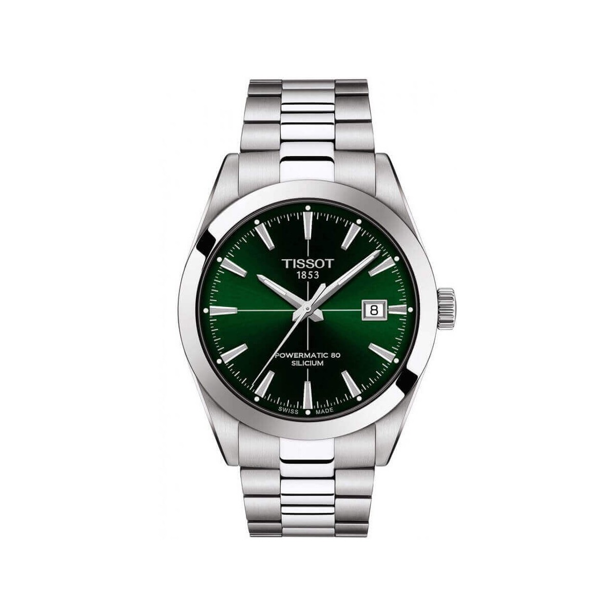 Orologio maschile Tissot della collezione Gentleman con movimento automatico POWERMATIC 80.811 con riserva di carica fino a 80 ore. L'orologio è realizzato in acciaio inossidabile lavorato lucido e satinato con cassa 40mm montante vetro zaffiro ed antigraffio che protegge il quadrante verde con indici e lancette in contrasto acciaio, datario posto ad ore 3, fondello a vista. Il Tissot Gentleman risulta essere un orologio versatile, ergonomico ed elegante ideale per qualsiasi occasione.