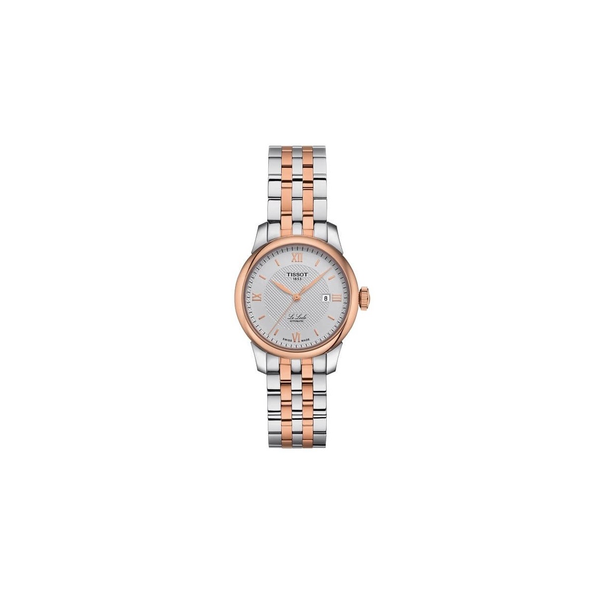 Orologio donna Le Locle Tissot, della collezione T-Classic, con movimento automatico, realizzato in acciaio inossidabile 316L misto con trattamento PVD oro rosa, con cassa rotonda del diametro di 29mm e vetro zaffiro che protegge il quadrante color bianco con datario posto a ore tre, indici romani e lancette dorate, fondello a vista e cinturino a chiusura farfalla con pulsanti.