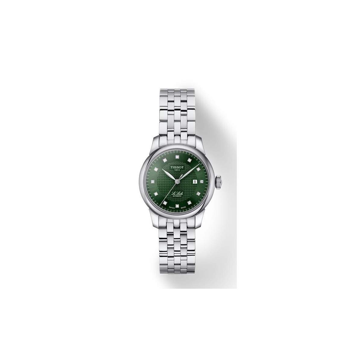 Orologio donna Le Locle Tissot, della collezione T-Classic, con funzione di solo tempo e movimento automatico, realizzato in acciaio inossidabile 316L con cassa rotonda del diametro di 29mm, montante vetro zaffiro con lavorazione antigraffio ed antiriflesso e quadrante verde lavorazione gilloche, impreziosito da piccoli diamanti al posto degli indici, datario ad ore 3 a fondello con movimento a vista.