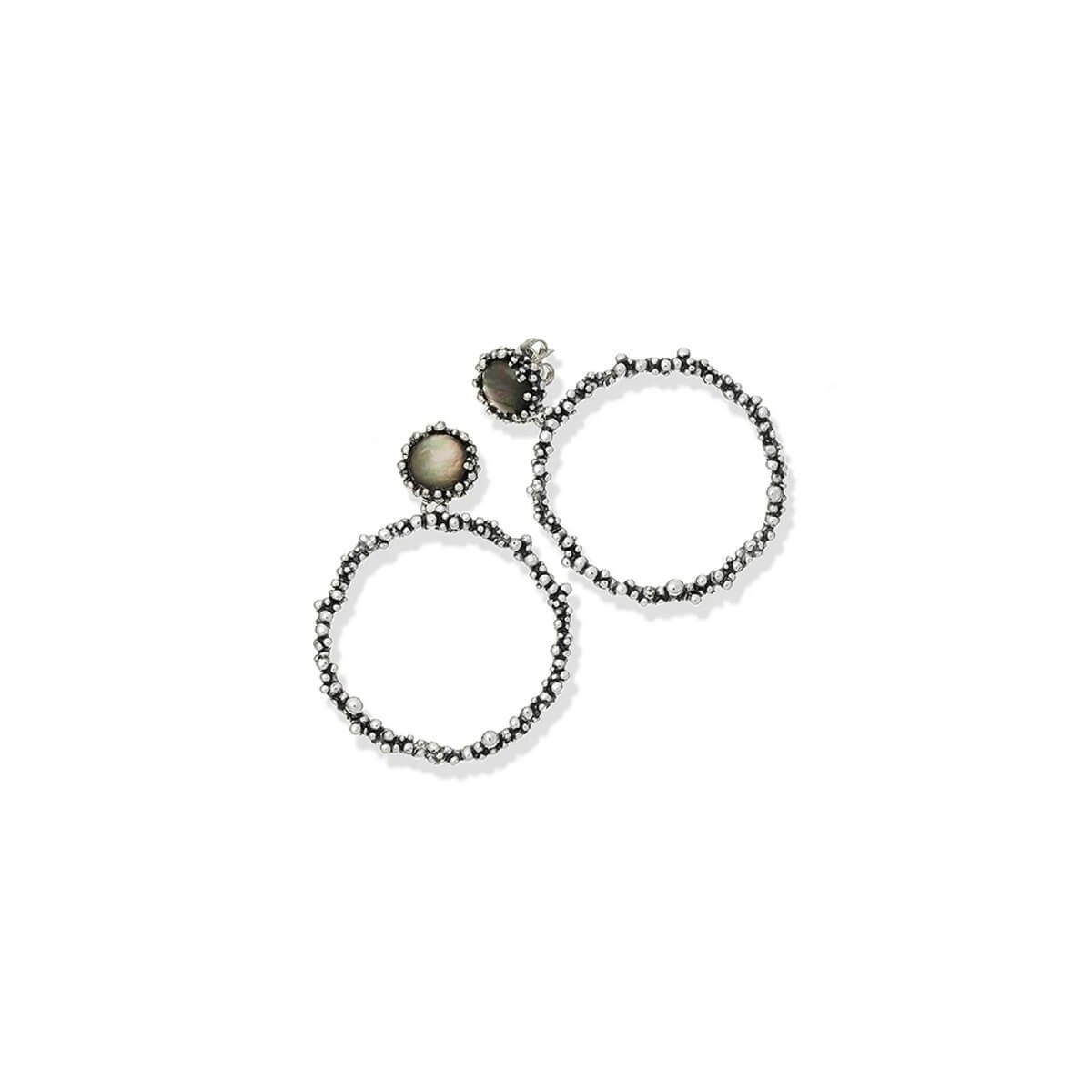 Orecchini femminili della collezione Maui ispirata all'omonima isola delle Hawaii. Realizzato in prezioso argento 925 gli orecchini sono caratterizzati da base lobo resi unici dalla presenza di madreperla e quarzo idrotermale nelle sfumature del grigio, rosa e verde che ci regalano i colori dell'alba e pendente a cerchio con micro boule in argento. Chiusura a farfallina.