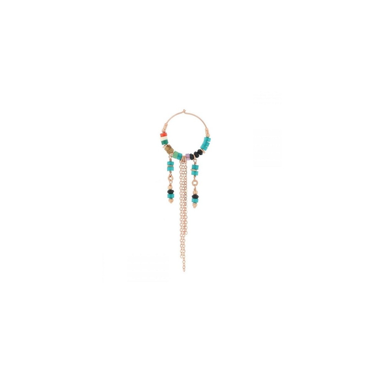 Orecchino singolo a cerchio Maman et Sophie, della collezione America Hippy, realizzato in argento 925 con galvanica oro rosa ed impreziosito da piccole pietre colorate composte da Ametista, Corallo, Aulite bianca, Agata Verde, Paesina, Giada e Quarzo azzurro. Completano l'orecchino delle catene rosè pendenti centrali.