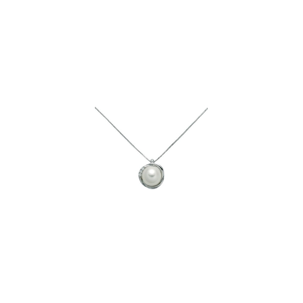 Collana da donna Miluna della collezione Parure Perle dal design elegante e senza tempo perfette per qualsiasi occasione, sono realizzate in oro bianco 18kt con pendente perla bianca Oriente dal diametro 8- 8,5 mm contornate da un torchon in oro bianco, impreziosito da tre diamanti taglio brillante rotondo di 0,018 ct. Chiusura a moschettone.
