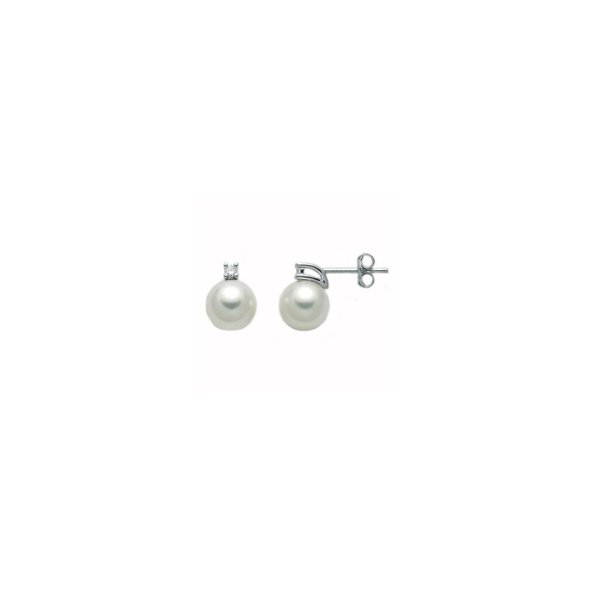 Orecchini a lobo Miluna della collezione Perle Punti Luce realizzate in oro bianco 18kt con perle naturali bianche coltivate Akoya del diametro 6,5 - 7 mm impreziosite da due diamanti taglio brillante con un peso di 0,03 carati. Chiusura a perno.