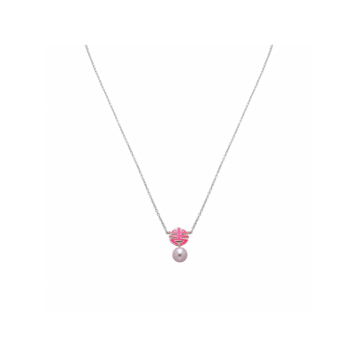 Collana girogola donna Mimì, della collezione Ognibene, realizzata in prezioso argento 925 con pendente composto dal logo della maison in oro rosa 9 carati smaltato di un vivace colore fucsia e perla coltivata Freshwater di 8 - 8,5 mm e di colore bianco.