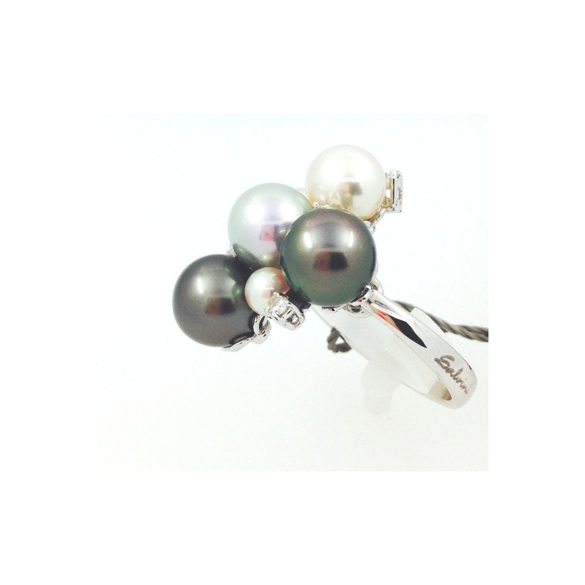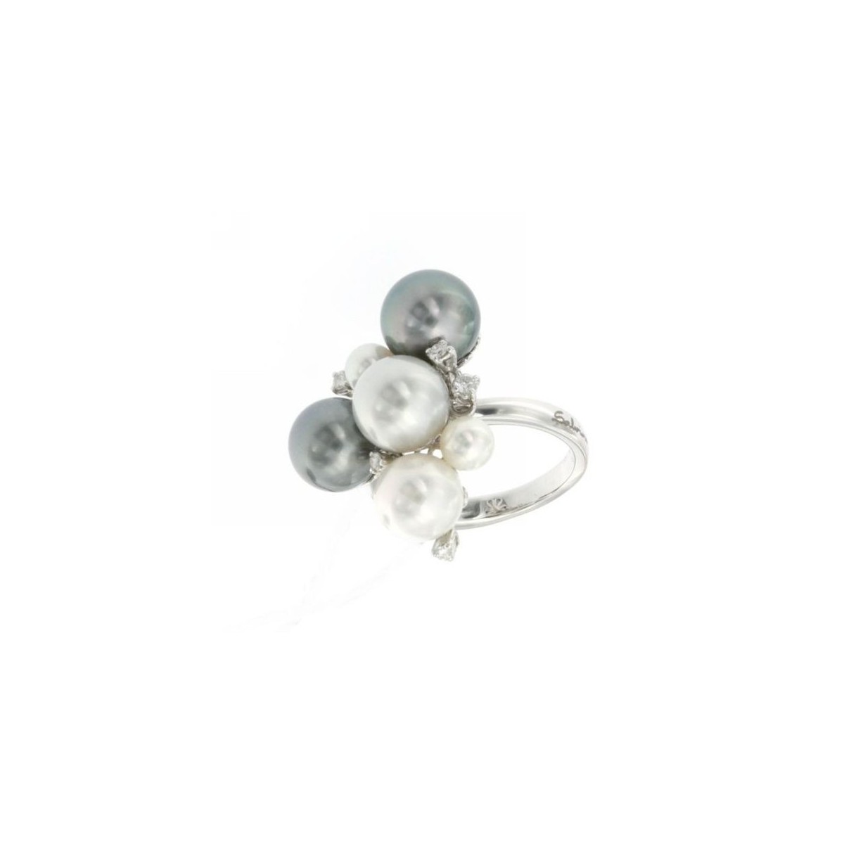 Anello in oro bianco 18kt con perle Multicolor di varie dimensioni sia bianche Akoya che nere e grigie di Tahiti e diamanti naturali taglio brillante