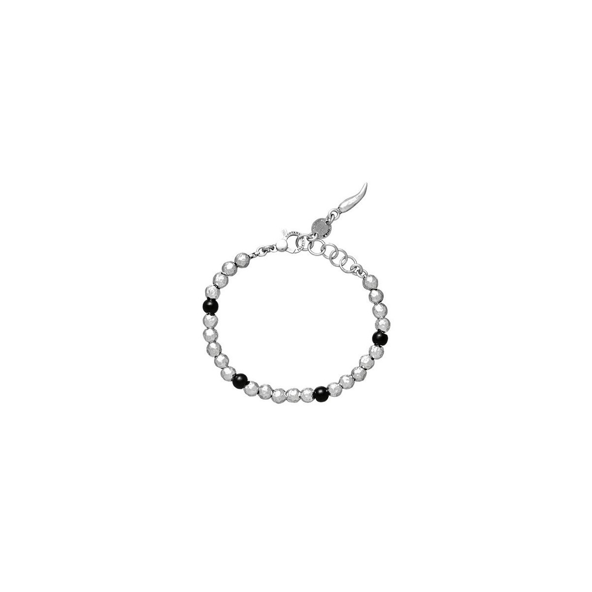 Bracciale, della collezione Optical, in argento 925. Ispirato alla moda anni 60, è realizzato da sferette in argento martellato alternate a sfere lucide di onice nera, fra bianco e nero, luce ed ombra. Chiusura a moschettone con maglie di regolazione.