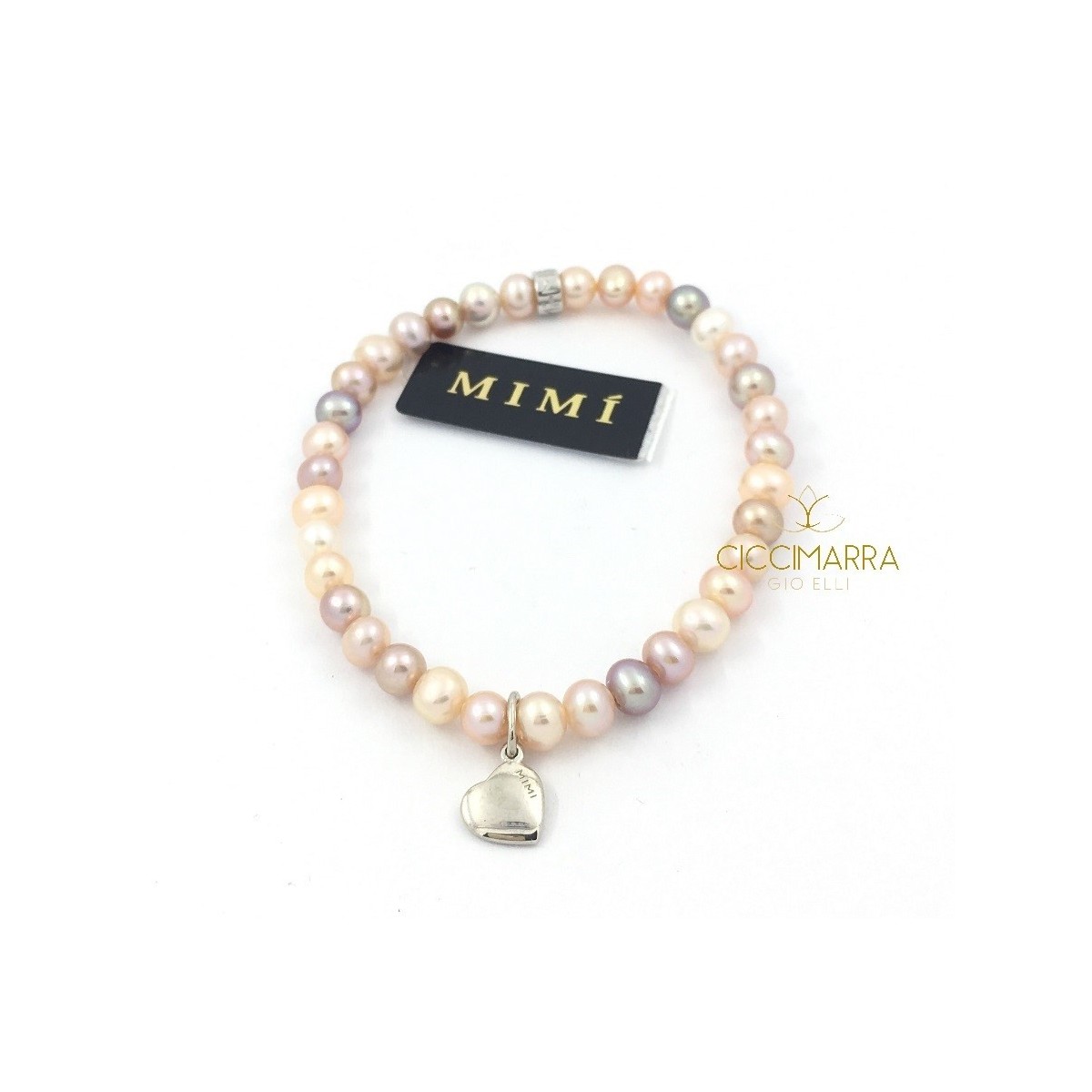 Variante del classico bracciale elastico con pendente in argento 925 a forma di cuore, abbinato ad una perla coltivata multicolor con il dadino logato Mimì