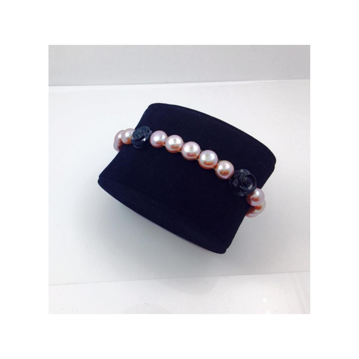 Bracciale Mimì elastico in perle a bottone viola e tre rose in agata nera