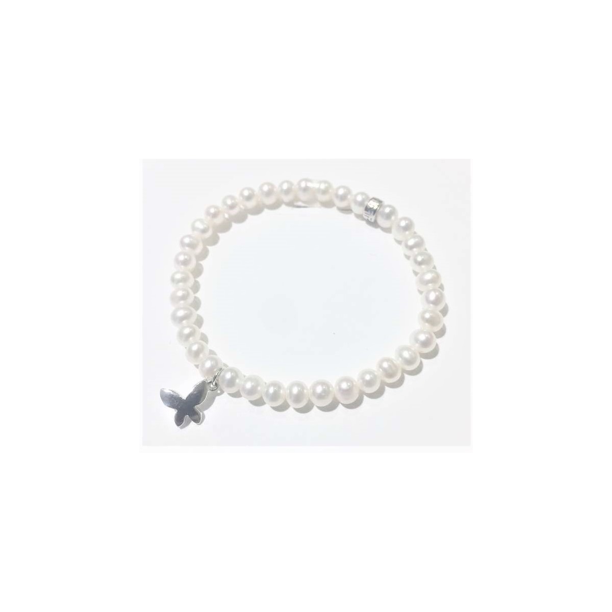 Variante del classico bracciale elastico con pendente in argento 925 a forma di farfalla, abbinato ad una perla coltivata bianca con il dadino logato Mimì